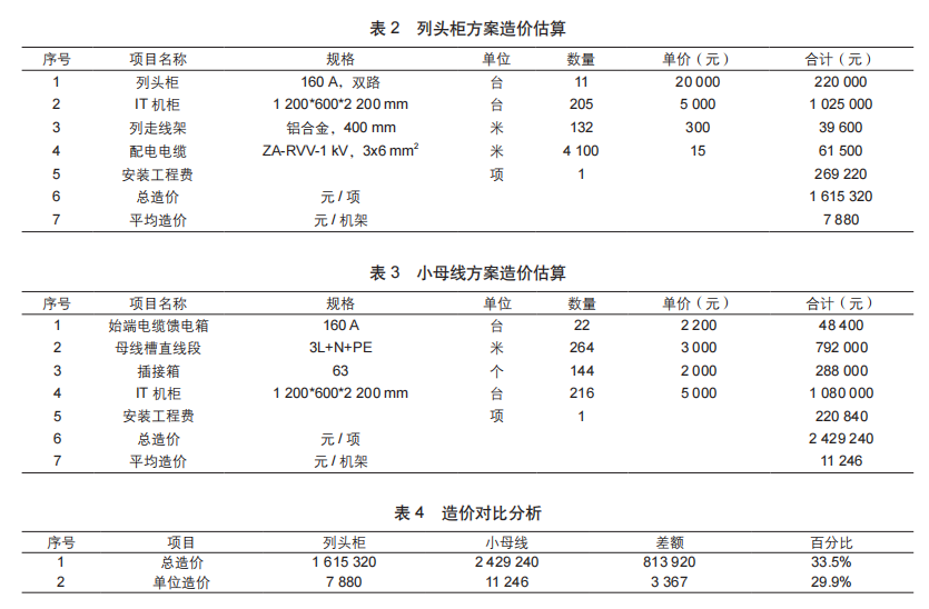 兩種方案造價(jià)對(duì)比:智能小母線方案造價(jià)較傳統(tǒng)列頭柜方案總造價(jià)約高33.5%;單機(jī)柜平均造價(jià)約高29.9%。